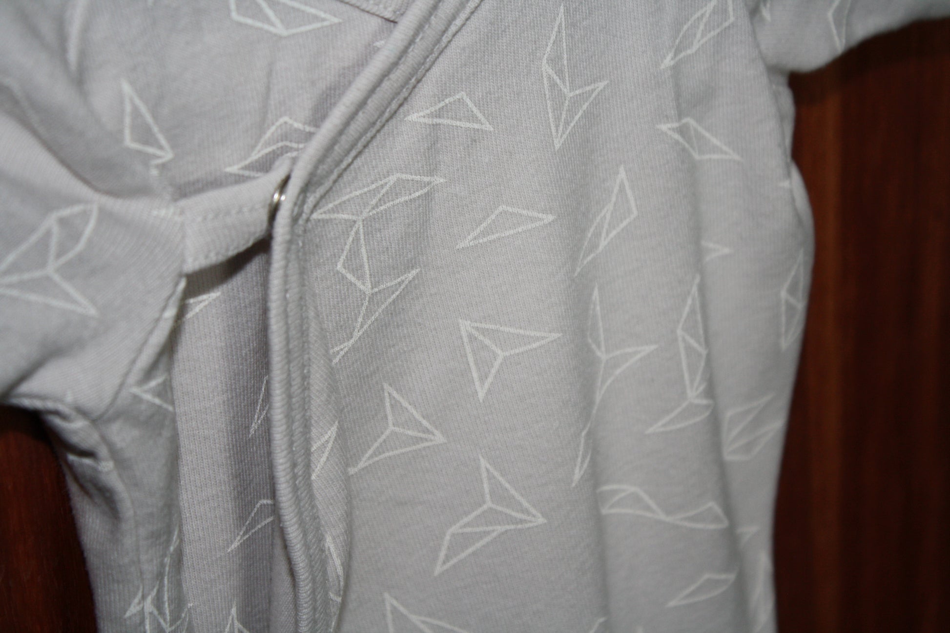 Kimono style wrap bodysuit with geometric pattern.